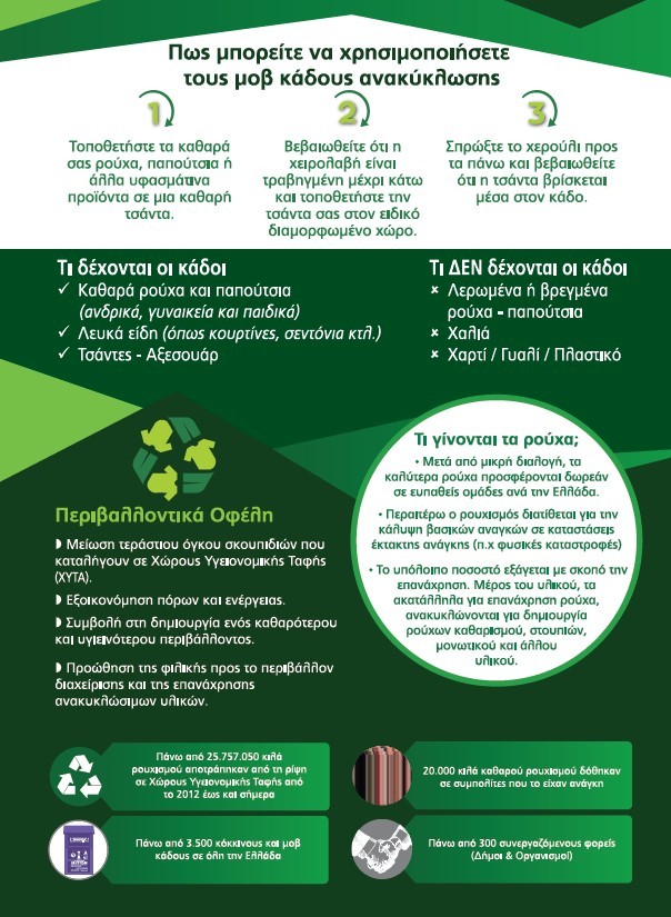 - Μέρος από τα ρούχα και τα υποδήματα που βρίσκονται σε καλή κατάσταση προσφέρονται δωρεάν σε ευπαθείς ομάδες σε συνεργασία με κοινοτικές αρχές, κοινωνικά παντοπωλεία και άλλους φορείς. Τα υπόλοιπα εξάγονται σε συνεργαζόμενα Κέντρα Ανακύκλωσης για επανάχρηση ή αξιοποιούνται σε περιπτώσεις έκτακτων αναγκών.