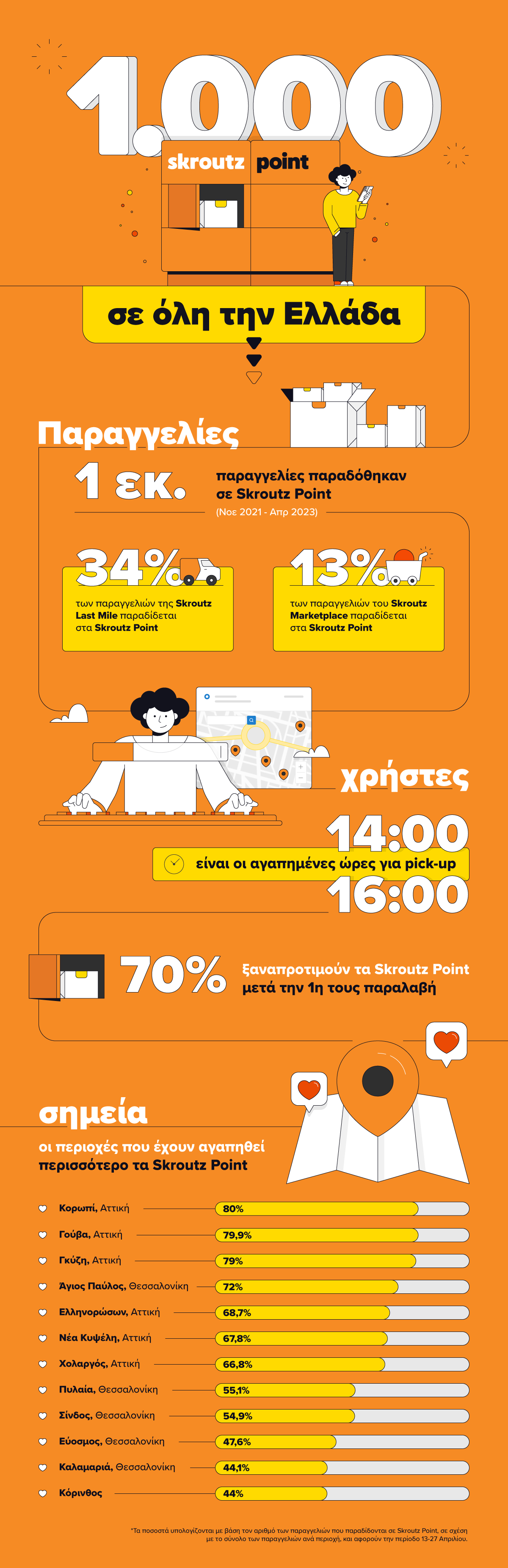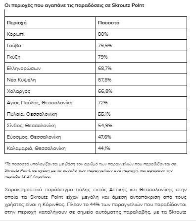 Χαρακτηριστικό της αγάπης που τρέφουν οι καταναλωτές σε αυτόν τον τρόπο παράδοσης αποτελεί ο υψηλός αριθμός παραγγελιών που έχει διαχειριστεί η Skroutz Last Mile μεταφορική προς Skroutz Point. Από το Νοέμβριο του 2021, όταν και τοποθετήθηκαν τα πρώτα Skroutz Point, μέχρι και σήμερα, σχεδόν 1 εκατ. παραγγελίες, έγιναν με παραλαβή από κάποιο σημείο αυτόματης παραλαβής. Ενώ την ίδια στιγμή πολύ υψηλό είναι και το ποσοστό των χρηστών που επιλέγει τα Skroutz Point σαν τρόπο παράδοσης σχεδόν καθολικά μετά την πρώτη τους εμπειρία με την υπηρεσία. Ποσοστό που αγγίζει το 70% κατα μέσο όρο, με αρκετές περιοχές της Αθήνας και της Θεσσαλονίκης να καταγράφουν ακόμα μεγαλύτερο.