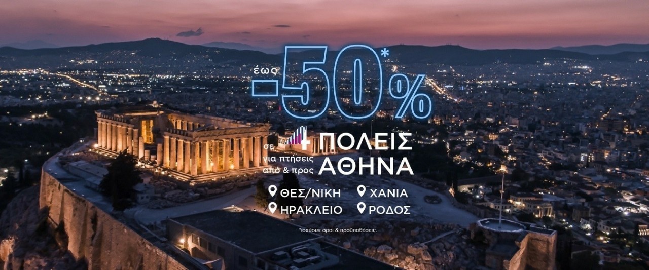 Συγκεκριμένα όπως ανακοίνωσε η εταιρεία η προσφορά ισχύει στις πτήσεις από και προς το Διεθνές Αεροδρόμιο Αθηνών με προορισμό τη Θεσσαλονίκη, τη Ρόδο, το Ηράκλειο και τα Χανιά.