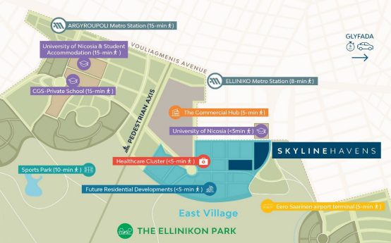 Αποτελώντας μία σημαντική νέα προσθήκη στη διεθνώς αναγνωρισμένη «έξυπνη πόλη» του The Ellinikon, το Skyline Havens δημιουργεί μια κοινότητα με πλούσιες παροχές, στην καρδιά του πολιτιστικού και εμπορικού κέντρου της ανάπτυξης. Μερικά μόλις λεπτά μακριά βρίσκονται κορυφαία ιδιωτικά εκπαιδευτικά ιδρύματα, ο σταθμός μετρό «Ελληνικό», το The Ellinikon Mall, καθώς και το εμβληματικό κτίριο των πρώην αεροπορικών αναχωρήσεων του αεροδρομίου — σχεδιασμένο από τον Eero Saarinen — το οποίο αναμορφώνεται σε σημαντικό πολιτιστικό κέντρο.