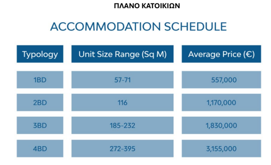 Οι τιμές αγοράς ξεκινούν από €485.000 και φτάνουν έως τα €4,5 εκατ., ενώ οι τιμές ανά τ.μ. κυμαίνονται μεταξύ €6.985 και €12.500, ανάλογα με το κτίριο και την τυπολογία. Το έργο προσφέρει ένα προσεκτικά επιλεγμένο φάσμα διαμερισμάτων, όπως παρουσιάζεται στον εγκεκριμένο πίνακα τυπολογιών: