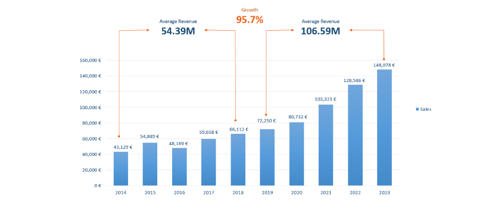 Η εισηγμένη αναλύει και τον ρυθμό ανάπτυξης του ομίλου κατά την τελευταία δεκαετία, όπου τα ευρήματα επιβεβαιώνουν μια δυναμική τάση αύξησης των εσόδων του από το 2014 έως το 2023. Από 43,129 εκατ. ευρώ στη χρήση του ’14, ο κύκλος εργασιών εκτινάχθηκε στα 148,078 εκατ. ευρώ το ’23 και επιπλέον, σημειώθηκε growth 95,7% από πενταετία, σε πενταετία: ο μέσος όρος εσόδων την περίοδο 2014-2018 άγγιξε τα 54,39 εκατ. ευρώ, έναντι 106,59 εκατ. ευρώ το 2019-2023.