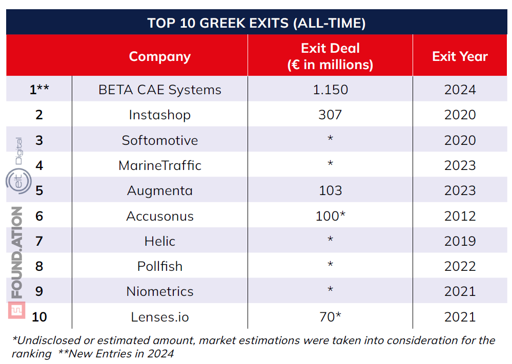 Στα μεγαλύτερα exits του ελληνικού startup οικοσυστήματος ακολουθεί πίσω από την BETA CAE Systems, η Instashop με το deal των 307 εκατ. ευρώ του 2020 και οι Softomotive, MarineTraffic, Augmenta, Accusonus με συμφωνίες άνω των 100 εκατ. ευρώ όπως και οι Helic, Pollfish, Niometrics, Lenses.io άνω των 70 εκατ. ευρώ.