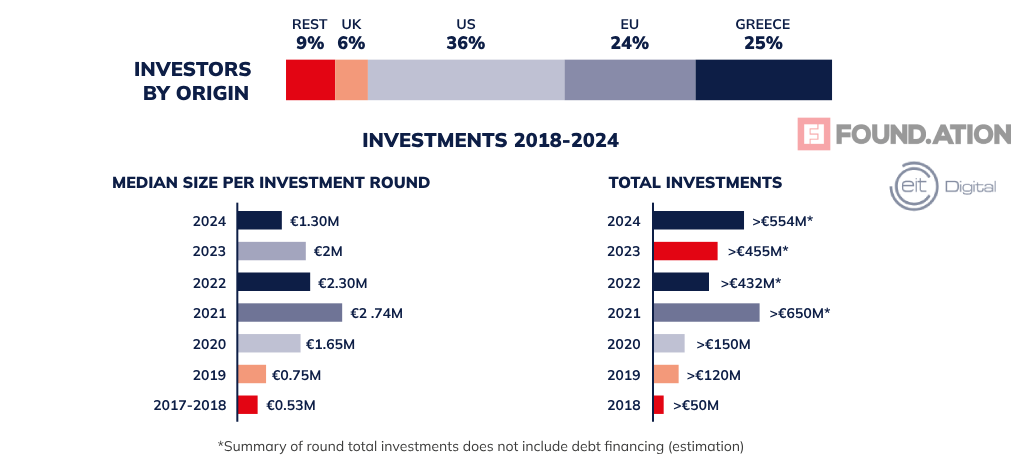Τα ξένα funds εξακολουθούν να επενδύουν σε ελληνικές startups με έντονους ρυθμούς. Το 2024, περισσότεροι από 156 διαφορετικοί επενδυτές συμμετείχαν σε γύρους χρηματοδότησης. Εντυπωσιακό είναι ότι το 36% αυτών προέρχονται από τις Ηνωμένες Πολιτείες. Διευρυμένα φορολογικά κίνητρα για angel investors και ένα νέο πρόγραμμα Golden Visa βρίσκονται στις κυβερνητικές στρατηγικές προσέλκυσης περισσότερων επενδύσεων στο μέλλον.