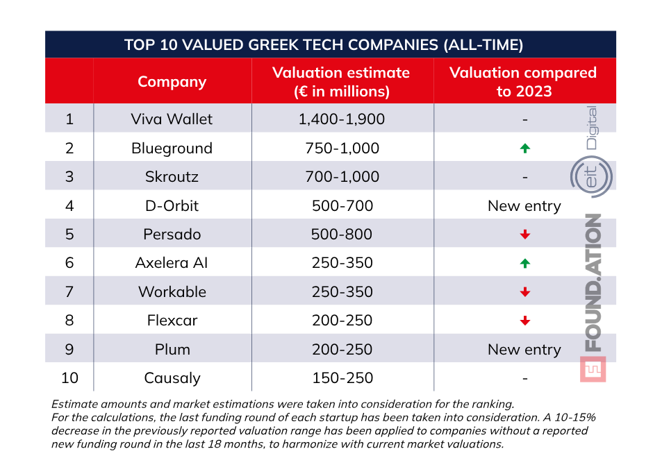 Στις πολυτιμότερες ελληνικές tech companies όλων των εποχών, η έρευνα κατατάσσει στους «μονόκερους» την Viva Wallet με αποτίμηση 1,4-1,9 δισ. ευρώ και το Top-10 συμπληρώνεται -με σημαντικές διακυμάνσεις- από τις Blueground (750 εκατ. ευρώ- 1 δισ. ευρώ), Skroutz (700 εκατ. ευρώ- 1 δισ. ευρώ), D-Orbit (500 εκατ. ευρώ-700 εκατ. ευρώ), Persado (500 εκατ. ευρώ-800 εκατ. ευρώ), Axelera AI (250 εκατ. ευρώ-350 εκατ. ευρώ), Workable (250 εκατ. ευρώ-350 εκατ. ευρώ), FlexCar (200 εκατ. ευρώ-250 εκατ. ευρώ), Plum (200 εκατ. ευρώ-250 εκατ. ευρώ) και Causaly (150 εκατ. ευρώ-250 εκατ. ευρώ).