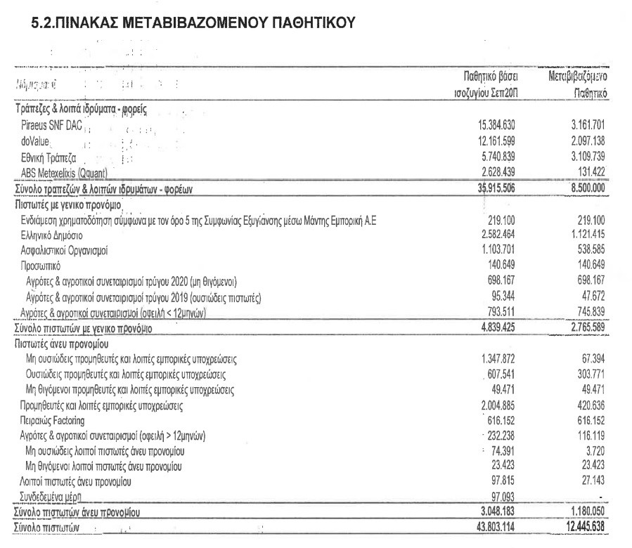 Σε ο,τι το παθητικό, με βάση το προτεινόμενο σχέδιο εξυγίανσης προβλέπεται μεταφορά στη νέα εταιρεία του 23,7% ή 8,5 εκατ. ευρώ, της συνολικής οφειλής, ύψους 35,916 εκατ. ευρώ που έχει σήμερα η οινοποιία σε Τράπεζες και λοιπά ιδρύματα – φορείς, δηλαδή σε Piraeus SNF DAC, doValue, Εθνική Τράπεζα και ABS Metexelixis (Qquant).