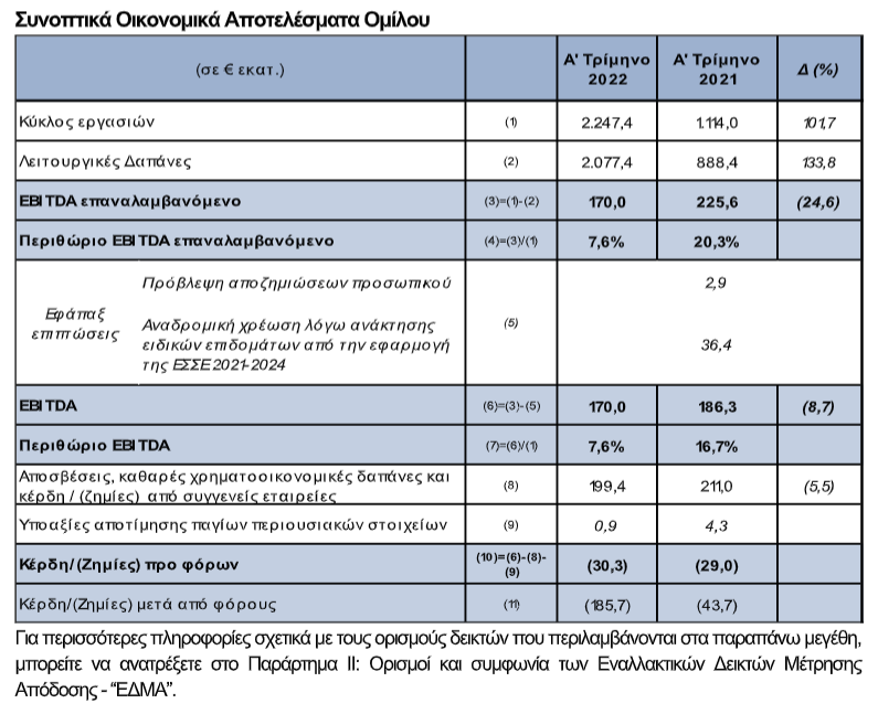 Τα κέρδη προ τόκων, φόρων και αποσβέσεων (EBITDA) σε επαναλαμβανόμενη βάση διαμορφώθηκαν σε €170 εκατ. το α’ τρίμηνο 2022 έναντι €225,6 εκατ. το α’ τρίμηνο 2021 για το σύνολο του Ομίλου, παρουσιάζοντας μείωση 24,6%, με το αντίστοιχο περιθώριο να διαμορφώνεται σε 7,6% από 20,3%, λόγω αύξησης του κύκλου εργασιών.
