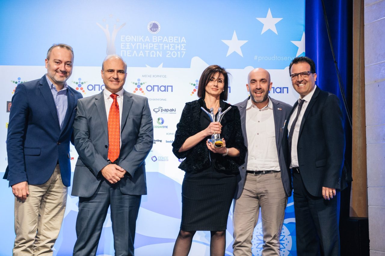 Την κορυφαία διάκριση «Κέντρο Τηλεφωνικής Εξυπηρέτησης Πελατών της Χρονιάς», απέσπασε για μία ακόμη χρονιά η COSMOTE στην φετινή απονομή των βραβείων του Ελληνικού Ινστιτούτου Εξυπηρέτησης Πελατών (ΕΙΕΠ). Στην τελετή, που πραγματοποιήθηκε την περασμένη Τετάρτη στο Μέγαρο Μουσικής Αθηνών, η COSMOTE διακρίθηκε στην κατηγορία «Μεγάλος Οργανισμός». Στην κεντρική φωτογραφία διακρίνονται από δεξιά ο κ. Θανάσης Στράτος Executive Director Εξυπηρέτησης Πελατών Σταθερής & Κινητής Ομίλου OTE, ο κ. Απόστολος Μάρης Διευθυντής Εξυπηρέτησης Πελατών & Τηλεφωνικών Πωλήσεων Σταθερής & Κινητής Ομίλου OTE, η κα. Σάντυ Χειλαδάκη, ο κ. Παντελής Λαναράς Υποδιευθυντής Ανάπτυξης, Σχεδιασμού & Υποστήριξης Λειτουργιών Εξυπηρέτησης Σταθερής & Κινητής Ομίλου OTE, και ο κ. Φρανκ Μαούνης Co-founder / Executive Chairman του Papaki, που έκανε την απονομή του βραβείου.