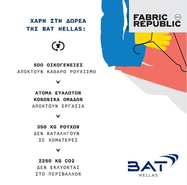Η Αθηνά Πηλιτζίδου, Υπεύθυνη Προγράμματος Fabric Republic, δήλωσε: «Η υποστήριξη της BAT Hellas είναι ιδιαίτερα σημαντική για εμάς, ειδικότερα σε μια τόσο δύσκολη εποχή όπως αυτή που διανύουμε, ώστε να συνεχίσουμε το έργο μας. Κάθε πρωτοβουλία, όσο μικρή ή μεγάλη, που μας οδηγεί σε ένα πιο δίκαιο και βιώσιμο κόσμο μάς γεμίζει με αισιοδοξία και συμβάλλει σε μια νέα, πιο δίκαιη πραγματικότητα.»