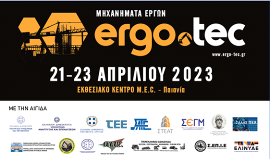 Η 1η διεθνής έκθεση ERGO.TEC θα πραγματοποιηθεί στις 21 – 23 Απριλίου 2023 στο MEC Παιανίας και θα δώσει την ευκαιρία σε κορυφαίους κατασκευαστές, εισαγωγείς και αντιπροσώπους μηχανημάτων έργων να προβληθούν και να παρουσιάσουν τα προϊόντα και τις υπηρεσίες τους.
