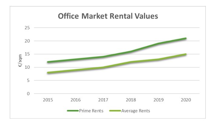 H αγορά γραφειακών χώρων της Αθήνας παραμένει σε ανοδική τροχιά, προσπαθώντας να βρει το βηματισμό της και καλό ‘’προϊόν’’. Οι αποδόσεις και οι μισθωτικές αξίες δε φαίνεται να έχουν επηρεαστεί ιδιαίτερα λόγω της πανδημίας, ενδεχομένως λόγω της έλλειψης καλού ποιοτικού προϊόντος.