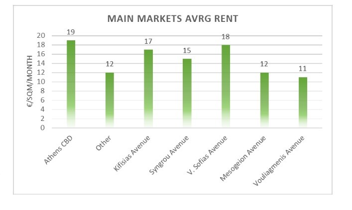 Ενδεικτικά το μέσο ενοίκιο στον Κεντρικό Επιχειρηματικό Αξονα της ελληνικής πρωτεύουσας, τη λεωφόρο Βασιλίσσης Σοφίας, στο κέντρο της πρωτεύουσας, είναι κοντά στα 19 ευρώ ανά τ.μ. και στην περιοχή που δεν είναι τόσο κεντρικά κοντά στα 18 ευρώ ανά τ.μ., στη λεωφόρο Κηφισίας στα 17 ευρώ ανά τ.μ., στη λεωφόρο Συγγρού στα 15 ευρώ ανά τ.μ. και ακολουθούν οι λεωφόροι Μεσογείων και Βουλιαγμένης με 12 και 11 ευρώ ανά τ.μ..