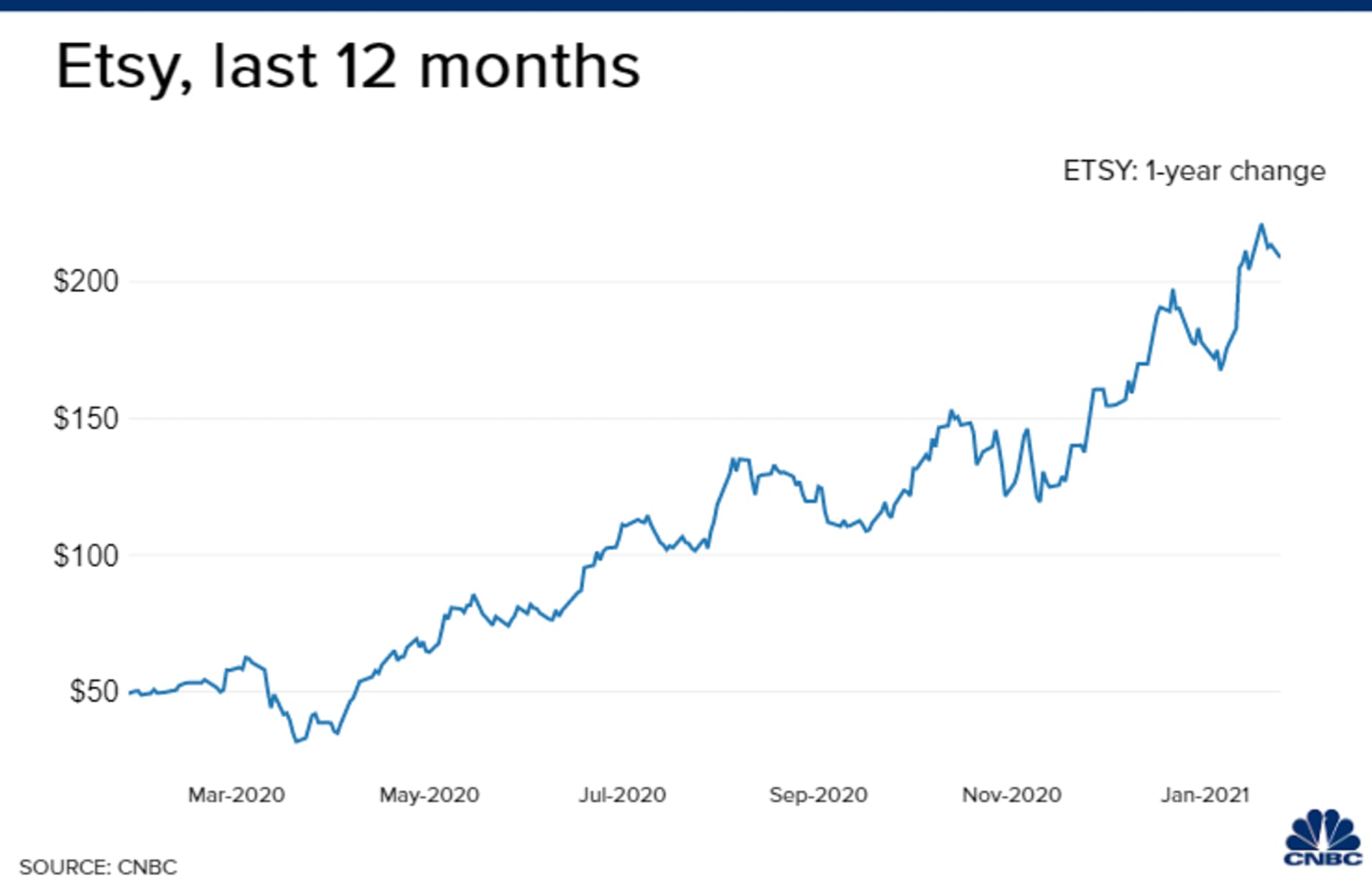 Οι μετοχές της Etsy έχουν καταγράψει άνοδο κατά περισσότερο από 313% τους τελευταίους 12 μήνες, καθώς η εταιρεία ηλεκτρονικού εμπορίου έχει ωφεληθεί ιδιαίτερα από την πανδημία κορωνοϊού. Ήδη για φέτος η μετοχή έχει σημειώσει άνοδο κατά 17% .