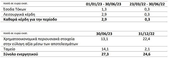 Τα βασικά μεγέθη της Εταιρείας για το για το 1ο εξάμηνο 2023 παρουσιάζονται στον παρακάτω πίνακα: