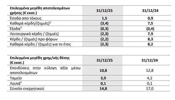 Το 2025 η Εταιρεία κατέγραψε ζημιές από χρηματοοικονομικά μέσα που αποτιμώνται σε εύλογη αξία μέσω των αποτελεσμάτων ύψους €3,4 εκατ.. Η μείωση της εύλογης αξίας των χρηματοοικονομικών περιουσιακών στοιχείων που αποτιμώνται στην εύλογη αξία μέσω αποτελεσμάτων κατά το τρέχον έτος, οφείλεται κυρίως σε προσαρμογές των εκτιμώμενων μελλοντικών ταμειακών ροών των ομολογιών, προεκβάλλοντας τα πραγματικά ποσοστά εισπραξιμότητας έως σήμερα, για τα οποία δεν αναμένεται αύξηση στο προσεχές μέλλον λαμβάνοντας υπόψη τις τελευταίες εξελίξεις.