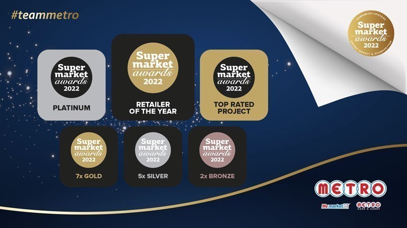 Ένα Platinum, ένα Top Rated Project, επτά Gold, πέντε Silver και δύο Bronze βραβεία συμπλήρωσαν το κάδρο διακρίσεων της METRO AEBE στη βραδιά απονομής των Super Market Awards 2022!