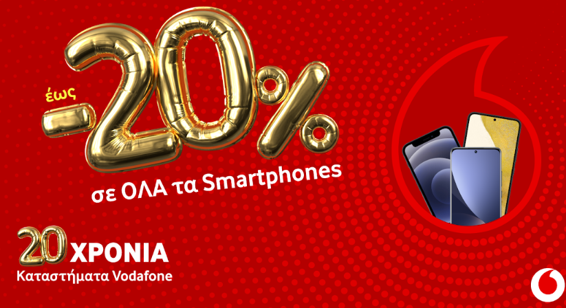 Τα καταστήματα Vodafone γιορτάζουν 20 χρόνια συνεχούς λειτουργίας μέσα από 263 σημεία εξυπηρέτησης σε όλη την Ελλάδα και προσφέρουν έως και -20% σε όλα τα Smartphones, ώστε όλοι να έχουν την ευκαιρία να γιορτάσουν μαζί με τη Vodafone σε αυτή τη σημαντική στιγμή.
