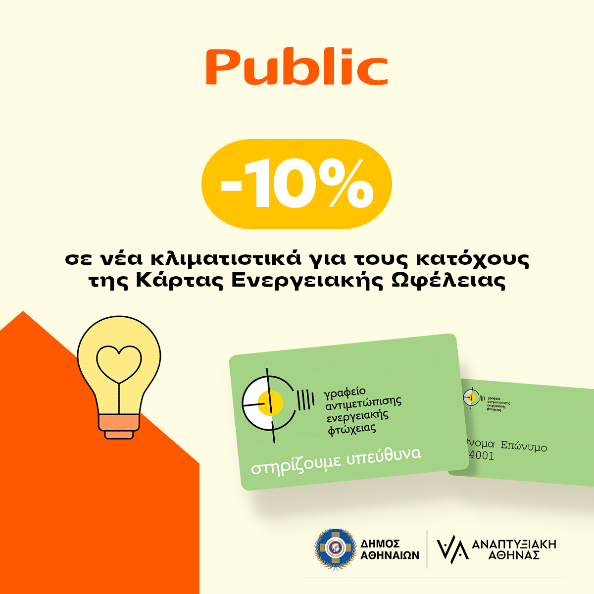 Τα Public, με στόχο την ενίσχυση των ενεργειακά ευάλωτων πολιτών, προσφέρουν ένα σύγχρονο, οικονομικό και αποδοτικότερο κλιματιστικό σε ακόμα πιο προσιτή τιμή. Έτσι, σε συνέχεια της νέας καμπάνιας με βασικό μήνυμα “Don’t Worry Go Public”, ανακοινώνουν τη συνεργασία τους με τον Δήμο Αθηναίων και την ένταξή τους στο δίκτυο συνεργαζόμενων επιχειρήσεων, συμμετέχοντας στην Κάρτα Ενεργειακής Ωφέλειας που εκδίδει το Γραφείο Αντιμετώπισης της Ενεργειακής Φτώχειας (ΓΑΕΦ).