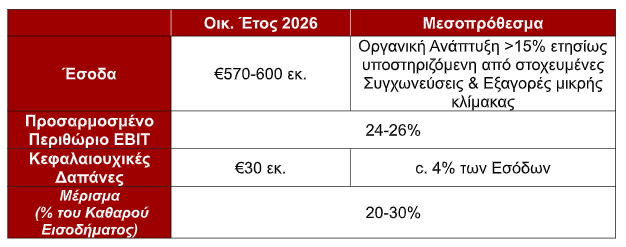 - Μικρές συμπληρωματικές Συγχωνεύσεις & Εξαγορές (bolt‑on M&A) προβλέπονται για τη χρήση 2026, προς ενίσχυση τεχνολογικών δυνατοτήτων και διεύρυνση του χαρτοφυλακίου προϊόντων, χωρίς έκδοση νέων μετοχών.