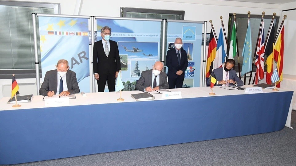 Στιγμιότυπο από την τελετή υπογραφής του συμβολαίου στην έδρα του OCCAR στη Bόννη – από αριστερά: Andreas Hülle, Διευ/νων Σύμβουλος της Hensoldt Optronics, Joachim Sucker, γερμανικό μέλος του Εποπτικού Συμβουλίου, Matteo Bisceglia, Διευθυντής OCCAR-EA, Rudy Debaene, βελγικό μέλος του Εποπτικού Συμβουλίου, και Κρίστιαν Χατζημηνάς, CEO Theon Sensors