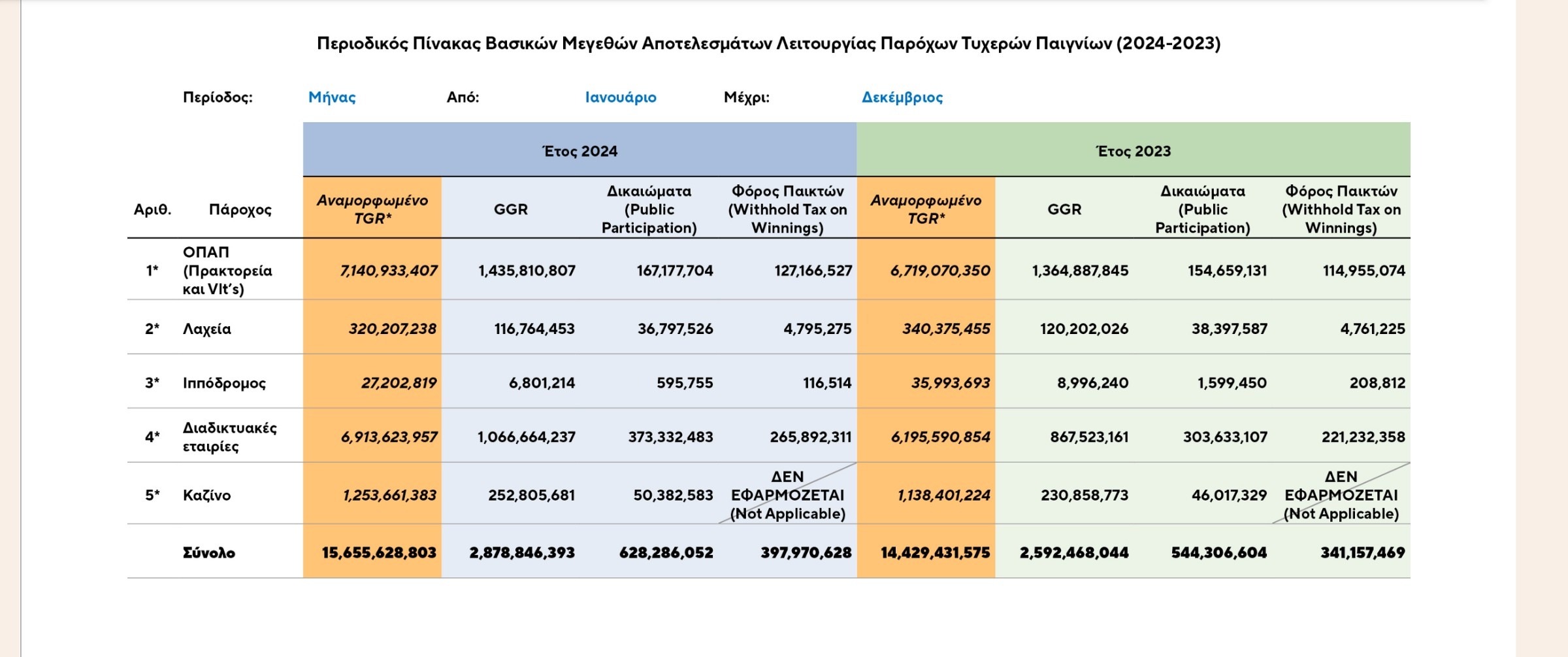 Με διψήφια άνοδο στα έσοδα (GGR) των παρόχων έκλεισε το 2024 για την αγορά των τυχερών παιχνιδιών στην Ελλάδα, καταγράφοντας ακόμη μια χρονιά ανάπτυξης. Οι επιδόσεις του ΟΠΑΠ και των διαδικτυακών εταιρειών αποτέλεσαν τον βασικό παράγοντα της ανόδου, ενώ παράλληλα, τα επίγεια καζίνο εμφάνισαν σημάδια ανάκαμψης.