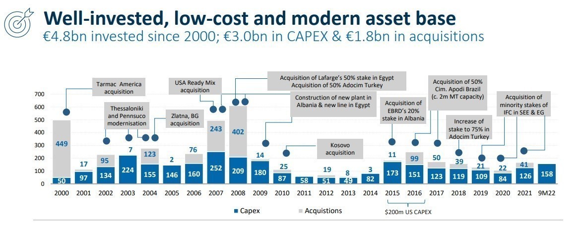 Συνολικά, σύμφωνα με τα στοιχεία που παρουσίασε χθες ο κ. Κολακίδης ο Όμιλος ΤΙΤΑΝ έχει κάνει συνολικές επενδύσεις απ’ το 2000 ως το 2022 περί τα 5 δισ ευρώ , εκ των οποίων τα 3 δισ ήταν το CAPEX και τα υπόλοιπα για εξαγορές που έκανε με στόχο τη διεθνοποίησή της.