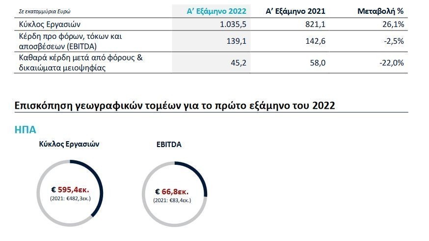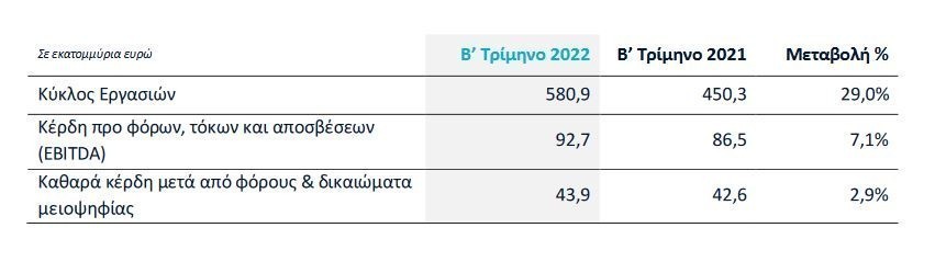 Ισχυρές, σύμφωνα με την εταιρική ανακοίνωση, ήταν οι επιδόσεις του ομίλου το β’ τρίμηνο, με αύξηση του κύκλου εργασιών κατά 29% σε σχέση με την ίδια περίοδο το 2021 και με ανάκαμψη της κερδοφορίας.