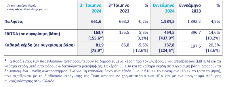 Αύξηση 20% σημείωσαν τα καθαρά κέρδη της Titan Cement International SA στο εννεάμηνο του 2024, σε σύγκριση με την αντίστοιχη περίοδο του 2023 και διαμορφώθηκαν σε 238 εκατ. ευρώ.