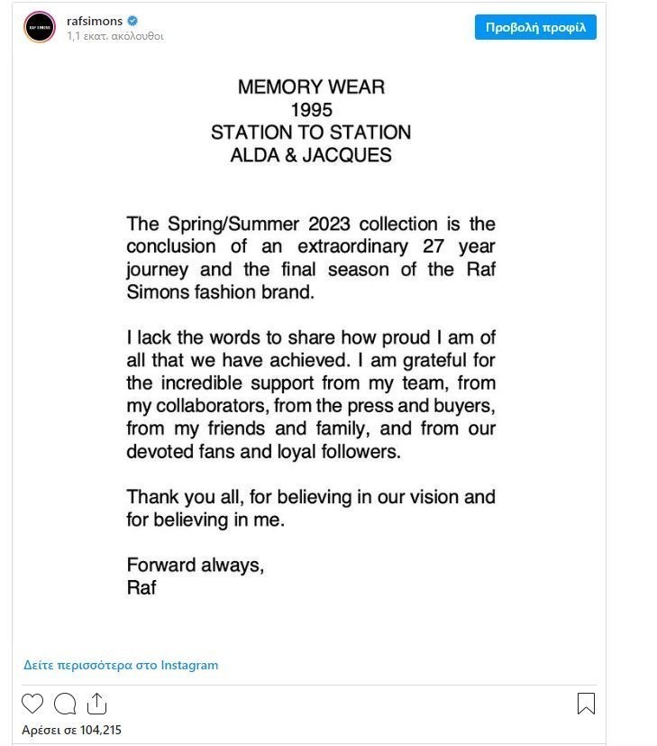 Ο βελγικής καταγωγής σχεδιαστής μόδας Ραφ Σίμονς κλείνει την ομώνυμη εταιρεία του μετά από 27 χρόνια. Μέσω μιας λιτής ανακοίνωσης στο Instagram χωρίς να εξηγεί τους λόγους αποκάλυψε ότι η συλλογή άνοιξη/καλοκαίρι 2023 που παρουσιάστηκε τον Οκτώβριο στο Λονδίνο είναι η τελευταία.