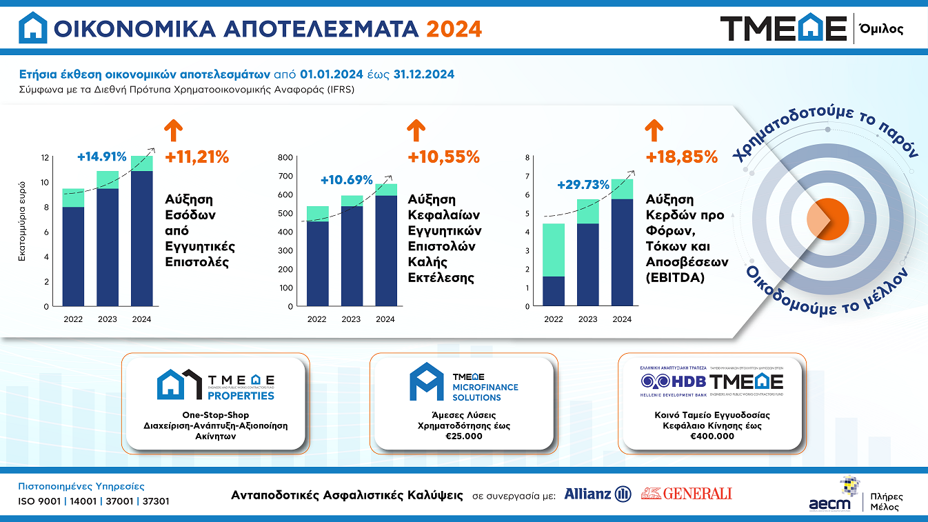 Το 2024 τα κέρδη προ φόρων, τόκων και αποσβέσεων (EBITDA) του ΤΜΕΔΕ ενισχύθηκαν κατά 18,85% σε σχέση με το 2023, στα 6,7 εκατ. ευρώ σε ατομική και κατά 17,62% σε ενοποιημένη βάση.