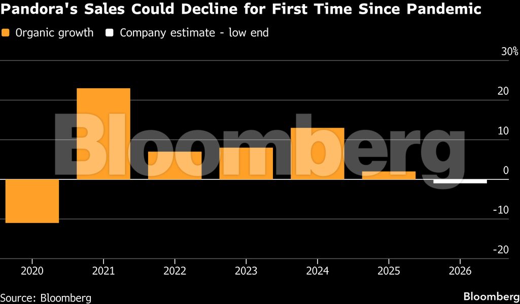 Η Pandora προέβλεψε επιβράδυνση των πωλήσεων για το τρέχον έτος και ανακοίνωσε ότι θα αναστείλει τα προγράμματα επαναγοράς μετοχών, περιορίζοντας παράλληλα την έκθεσή της στις έντονες διακυμάνσεις των τιμών του αργύρου.