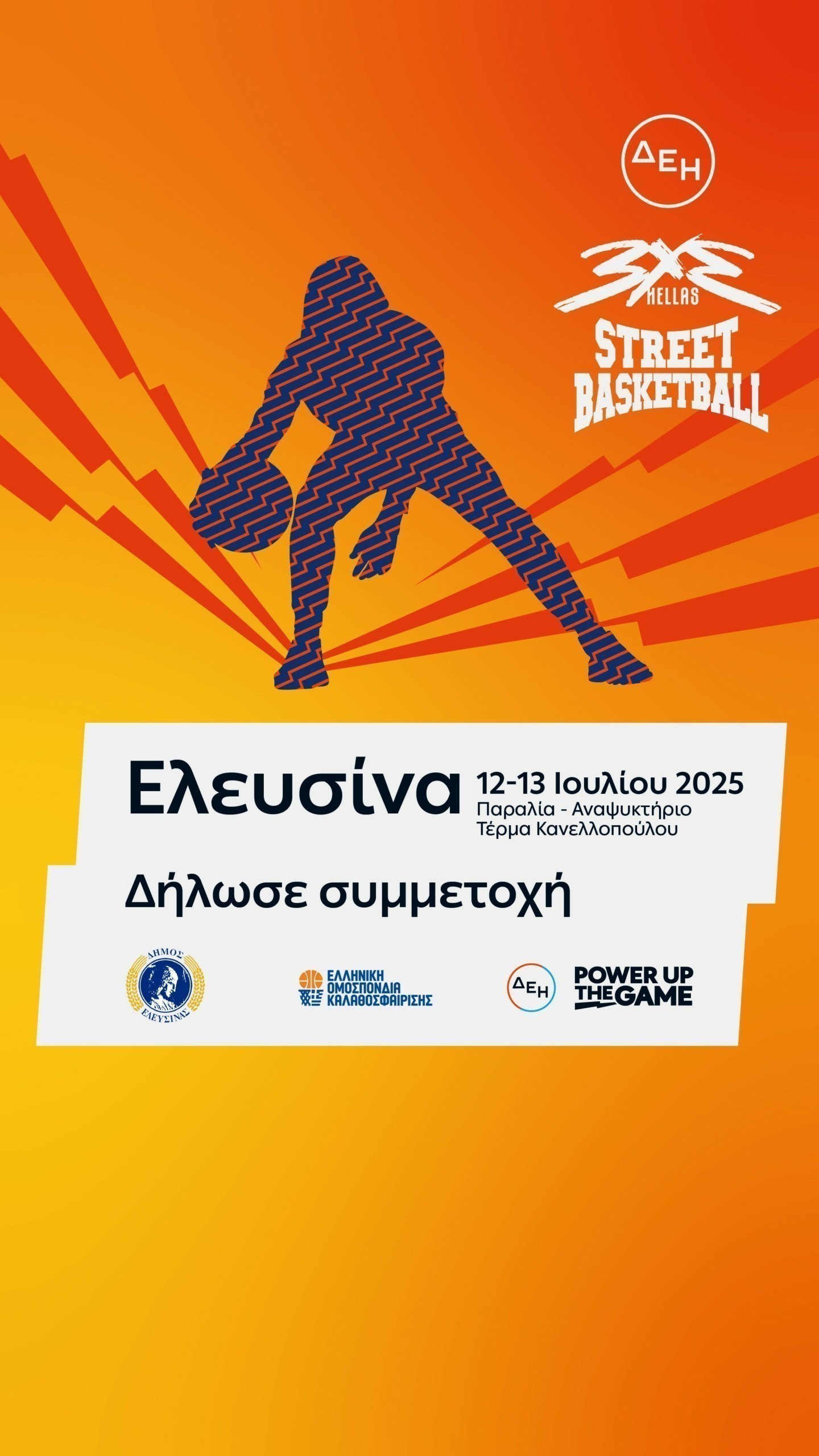 Το ΔΕΗ 3×3 Street Basketball συνεχίζει το ταξίδι του σε όλη την Ελλάδα και κάνει στάση στην Ελευσίνα, στις 12 και 13 Ιουλίου. Η παραλία της Ελευσίνας, στο Αναψυκτήριο (τέρμα Κανελλοπούλου), μεταμορφώνεται σε ανοιχτό γήπεδο 3×3 για όλους, με αγώνες που υπόσχονται ένταση, ρυθμό και πολλές εκπλήξεις.