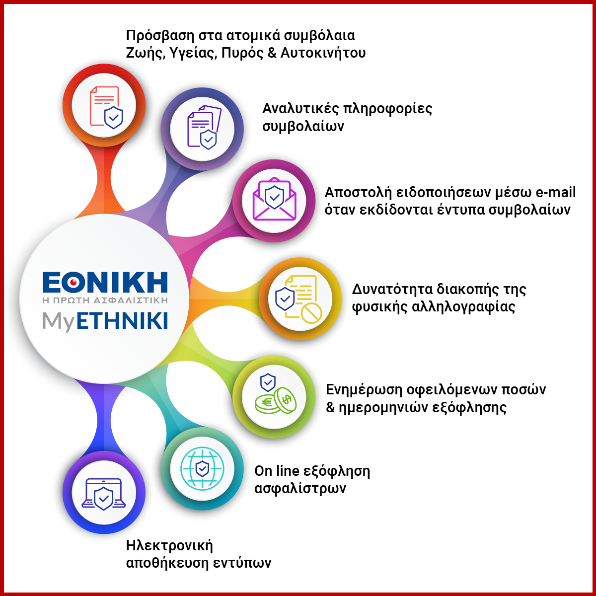 Το portal MyEthniki, την εποχή του ψηφιακού μετασχηματισμού, αποτελεί ένα διαθέσιμο μέσο επικοινωνίας μεταξύ της Εταιρίας και των ασφαλισμένων, το οποίο αναβαθμίζει την εξυπηρέτηση του πελάτη. Οι ασφαλισμένοι μπορούν οποιαδήποτε στιγμή της ημέρας, μέσω του νέου portal MyEthniki να λάβουν αναλυτικές πληροφορίες των συμβολαίων τους, των καλυπτόμενων μελών, να ενημερωθούν για τις εκκρεμότητες πληρωμής ασφαλίστρων και φυσικά να εξοφλούν τα ασφάλιστρά τους online. Επιπλέον, βρίσκουν χρήσιμες πληροφορίες για το πού να απευθυνθούν σε περίπτωση ατυχήματος, ζημιάς ή νοσηλείας, καθώς και για την εξυπηρέτηση των συμβολαίων τους.