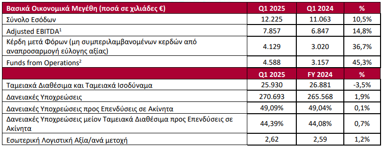 ▪ Τα Κεφάλαια από Λειτουργικές Δραστηριότητες (Funds from Operations) ανήλθαν σε 4,6 εκατ. ευρώ έναντι 3,1 εκατ. ευρώ (αυξημένα κατά 45,3%) σε σχέση με το Α’ Τρίμηνο 2024.