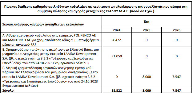 Ακόμη, με δεύτερη ανακοίνωση της εταιρείας σημειώνεται ότι σε περίπτωση μη ολοκλήρωσης της συναλλαγής που αφορά στη σύμβαση πώλησης και αγοράς των μετοχών της ΓΥΑΛΟΥ Μ.Α.Ε. (Smart Park), δεδομένου ότι υπόκειται στην εκπλήρωση ορισμένων συνήθων όρων και προϋποθέσεων που έχουν τεθεί από τα μέρη, τα καθαρά αντληθέντα κεφάλαια θα διατεθούν μέχρι της εξάντλησής τους και με χρονολογική σειρά, ως κάτωθι: