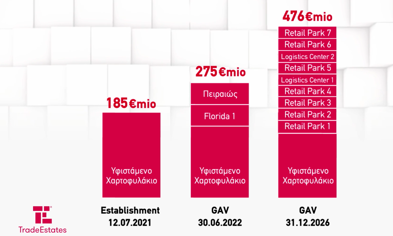 Η Trade Estates διαθέτει σήμερα στο χαρτοφυλάκιό της 9 εμπορικά ακίνητα -επτά εμπορικά πάρκα και δύο κέντρα logistics- με μία συνολική αξία 286 εκατ. ευρώ, μικτής εκμισθώσιμης επιφάνειας 225.770 τ.μ. και ετησιοποιημένα μισθωτικά έσοδα της τάξεως των 20 εκατ. ευρώ. Νούμερα, που αναμένεται να αυξηθούν, με βάση το επενδυτικό πλάνο της εταιρείας σε βάθος τετραετίας, έως το 2026, στα 18 ακίνητα, με μία αξία 476 εκατ. ευρώ, 470.000 τ.μ. εκμισθώσιμης επιφάνειας και 36 εκατ. ευρώ ετησιοποιημένα μισθωτικά έσοδα.