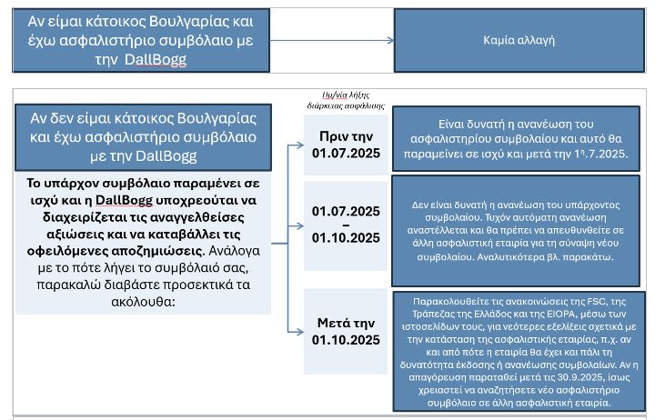 Για τους κατόχους ασφάλισης αυτοκινήτων: είναι υποχρεωτικό να έχετε έγκυρο συμβόλαιο ασφάλισης αστικής ευθύνης αυτοκινήτου και σε αντίθετη περίπτωση θα επέρχονται κυρώσεις ενώ δεν επιτρέπεται να οδηγείτε ανασφάλιστο όχημα. Οι πελάτες της DallBogg των οποίων το ασφαλιστήριο λήγει μεταξύ 1ης Ιουλίου και 1ης Οκτωβρίου πρέπει να συνάψουν νέο συμβόλαιο με άλλη ασφαλιστική εταιρία.