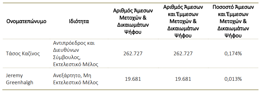 Κατά την 26.05.2022, ημερομηνία συνεδρίασης του Διοικητικού Συμβουλίου ως ανωτέρω, οι κ.κ. Τάσος Καζίνος και Jeremy Greenhalgh, κατέχουν άμεσα ή/και έμμεσα Μετοχές και δικαιώματα ψήφου στην Εταιρεία, ως ακολούθως: