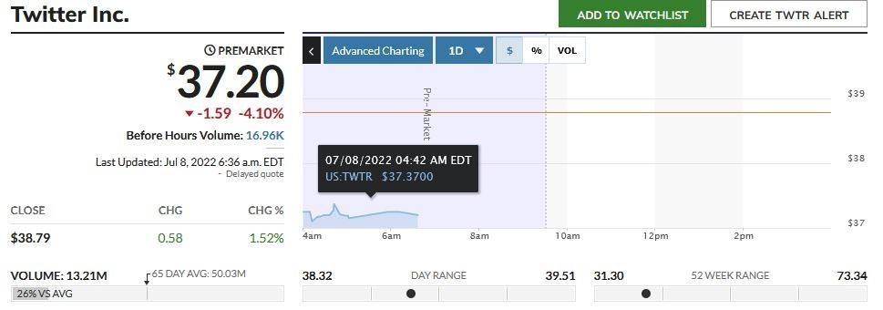 Βουτιά που ξεπερνά το 4% καταγράφουν οι μετοχές Twitter στις προσυνεδριακές συναλλαγές της Wall Street σήμερα, έπειτα από ρεπορτάζ σύμφωνα με το οποίο η εξαγορά της πλατφόρμας από τον Έλον Μασκ βρίσκεται σε «σοβαρό κίνδυνο».