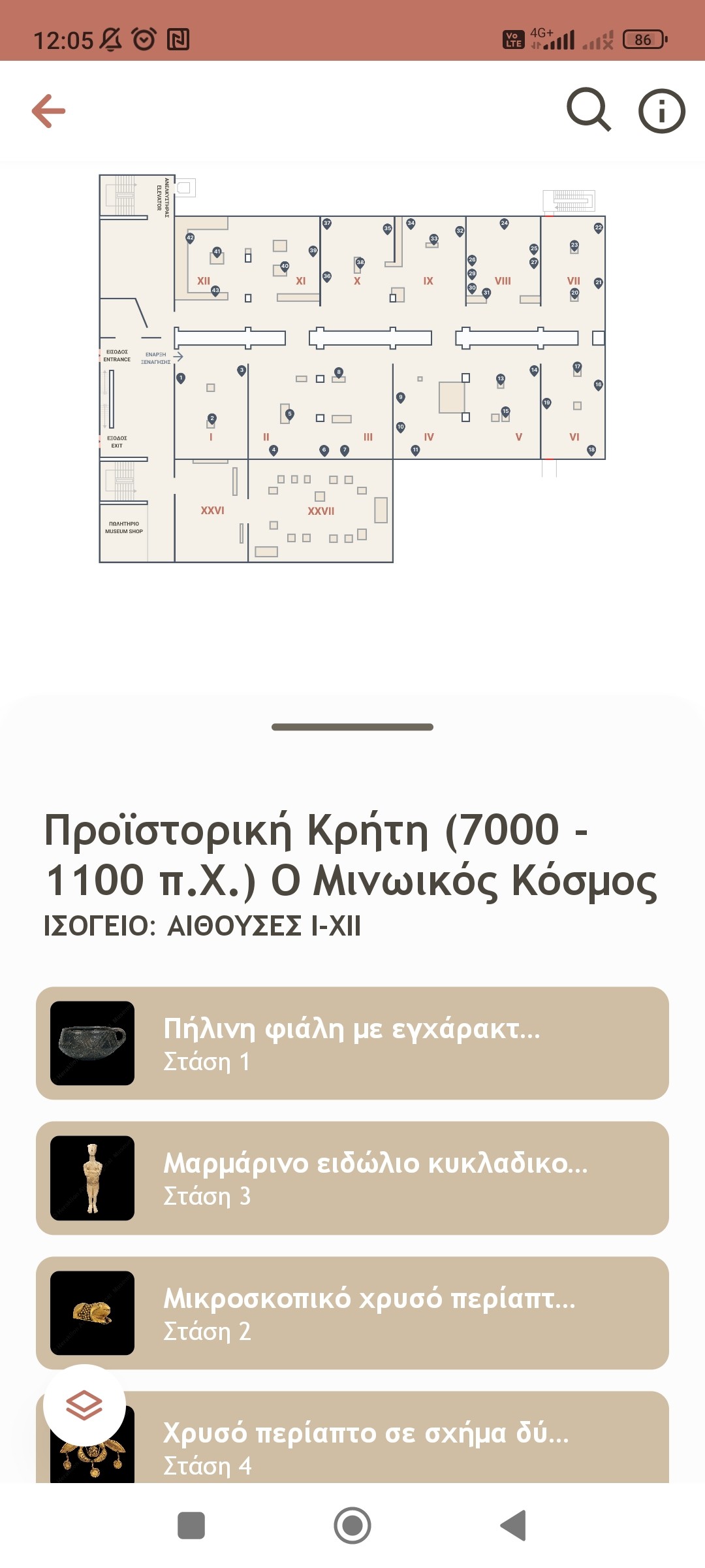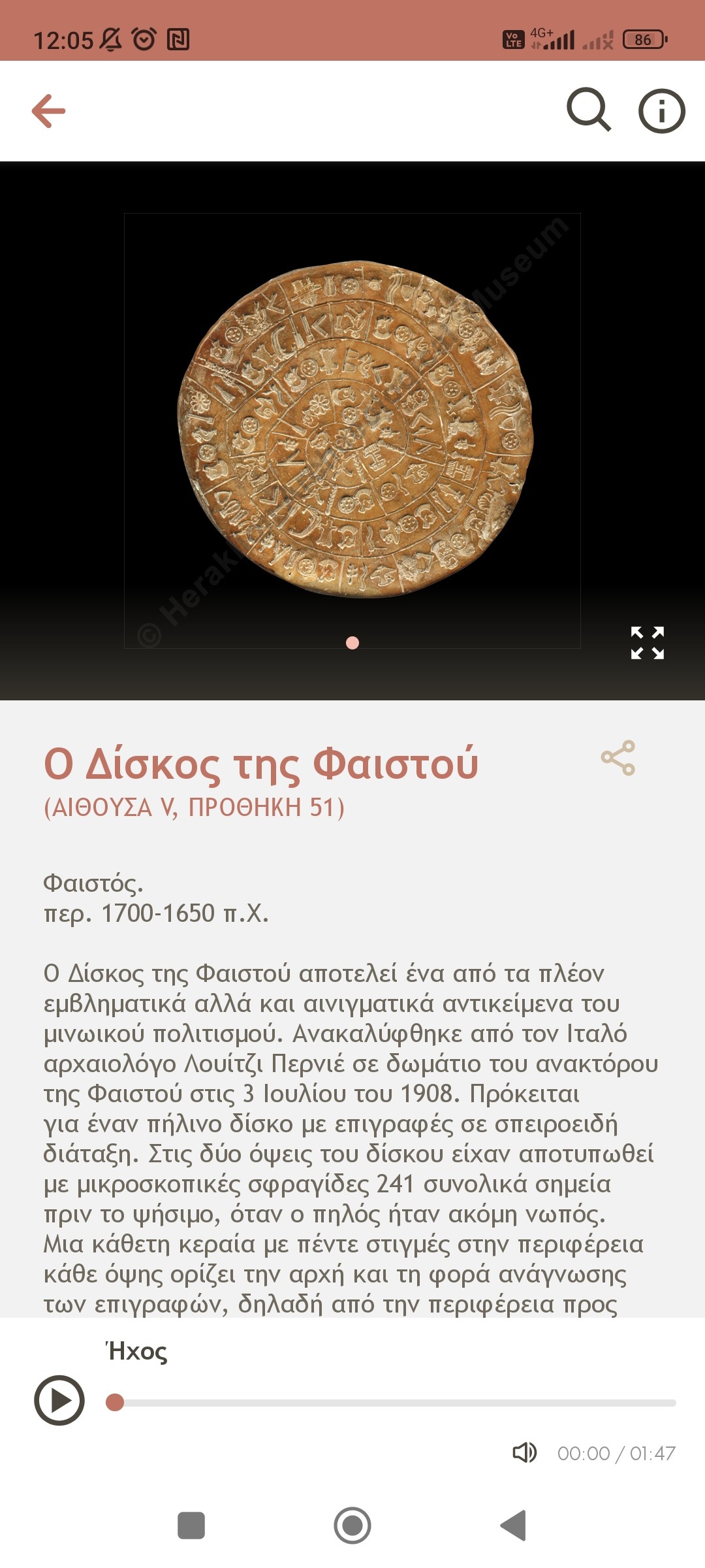 - ηχητικής ξενάγησης που αναπτύχθηκε στο πλαίσιο του παρόντος έργου, με 73 προβεβλημένα εκθέματα, μεταξύ των οποίων και ο Δίσκος της Φαιστού, και