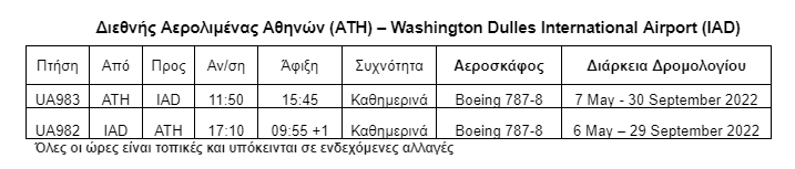 Η United Airlines επανεκκίνησε την ημερήσια και απευθείας εποχική σύνδεσή της μεταξύ Αθήνας και Νέας Υόρκης/Νιούαρκ. Οι πτήσεις είναι προγραμματισμένες έως τις 29 Οκτωβρίου, ενώ από τον επόμενο μήνα ξεκινά και η ημερήσια, απευθείας, εποχική πτήση της United προς την Ουάσινγκτον D.C., με ημερομηνία έναρξης τις 7 Μαΐου 2022.