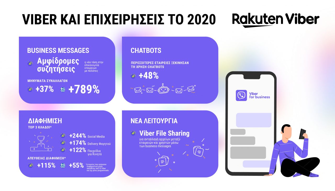 Το 2020 σημειώθηκε μια αύξηση 21% στη χρήση Business Messages στο Viber, αλλά το σημαντικότερο είναι η μεγαλύτερη αύξηση που σημειώθηκε στα μηνύματα συναλλαγών σε σχέση με αυτά που αφορούσαν κάποια προώθηση προϊόντος. Ενώ τα τελευταία αυξήθηκαν κατά 17%, τα μηνύματα που αφορούν συναλλαγές αυξήθηκαν κατά 37%, μια ένδειξη ότι οι εταιρείες έστειλαν πιο χρηστικό περιεχόμενο στους πελάτες τους, αντί για απλά προωθητικά μηνύματα. Αποστολή ιατρικών αποτελεσμάτων, χωρίς την ανάγκη του πελάτη να επισκεφτεί ξανά το μικροβιολογικό εργαστήριο, παρακολούθηση παραγγελίας, υπενθυμίσεις ραντεβού, όλα αυτά πλέον γίνονταν μέσω μηνυμάτων στο Viber.