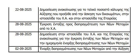 Ως ημερομηνία αποκοπής του δικαιώματος συμμετοχής στην παρούσα αύξηση με καταβολή μετρητών ορίζεται η 04.08.2025. Από την ίδια ημερομηνία (η «Ημερομηνία Αποκοπής»), οι μετοχές της Εταιρείας θα είναι διαπραγματεύσιμες στο Χ.Α. χωρίς το δικαίωμα συμμετοχής στην εν λόγω αύξηση και η τιμή εκκίνησης των μετοχών της Εταιρείας στο Χ.Α. θα διαμορφωθεί σύμφωνα με τον Κανονισμό του Χρηματιστηρίου Αθηνών, σε συνδυασμό με την υπ’ αριθ. 26 απόφαση του Δ.Σ. του Χ.Α., όπως ισχύει.