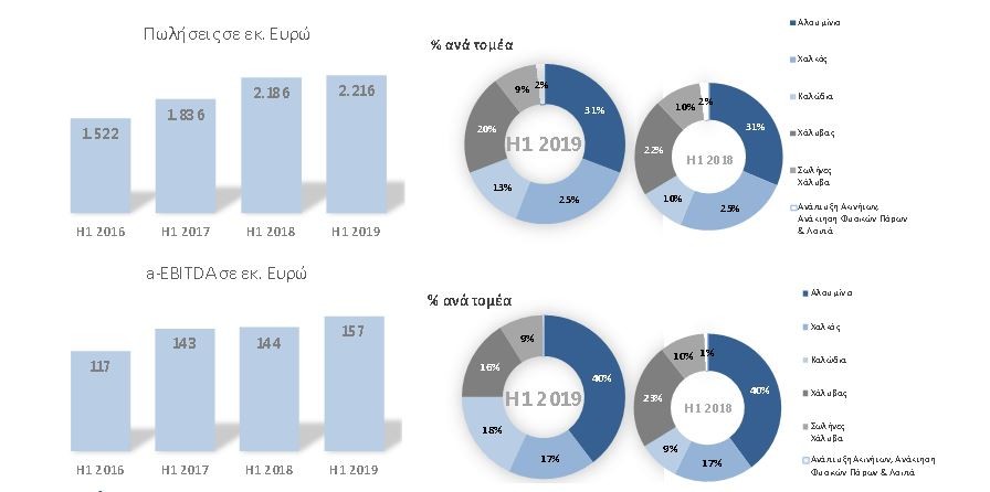 - Τo ενοποιημένο αναπροσαρμοσμένo EBITDA (a-EBITDA) αυξήθηκε κατά 9% και ανήλθε σε 157 εκ. ευρώ (πρώτο εξάμηνο 2018: 144 εκ. ευρώ), ενώ το ενοποιημένο EBITDA, το οποίο συμπεριλαμβάνει την επίδραση των τιμών μετάλλων, διαμορφώθηκε σε 139 εκ. ευρώ (πρώτο εξάμηνο 2018: 170 εκ. ευρώ).