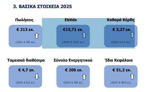 Το περιθώριο EBITDA ενισχύθηκε στο 7,37% από 6,85% το 2024, ενώ τα ίδια κεφάλαια αυξήθηκαν στα 51,21 εκατ. ευρώ από 48,88 εκατ. ευρώ. Το σύνολο του ενεργητικού ανήλθε στα 206,21 εκατ. ευρώ έναντι 204,19 εκατ. ευρώ το 2024.