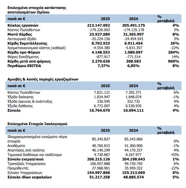 Σε ενοποιημένο επίπεδο, ο κύκλος εργασιών του ομίλου διαμορφώθηκε στα 213,15 εκατ. ευρώ το 2025, έναντι 205,49 εκατ. ευρώ το 2024, καταγράφοντας αύξηση 3,73%. Τα EBITDA ανήλθαν στα 15,71 εκατ. ευρώ από 14,07 εκατ. ευρώ το 2024, σημειώνοντας άνοδο 11,63%, σε σχέση με το 2024, ενώ τα κέρδη προ φόρων εκτινάχθηκαν στα 4,15 εκατ. ευρώ έναντι 1,08 εκατ. ευρώ την προηγούμενη χρήση, καταγράφοντας αύξηση 284%. Τα καθαρά κέρδη μετά φόρων ανήλθαν στα 3,27 εκατ. ευρώ από μόλις 0,31 εκατ. ευρώ το 2024, σημειώνοντας άνοδο 960%.