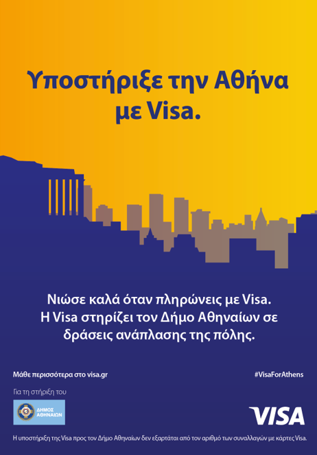 Η Visa ανακοινώνει το πρόγραμμα «Visa for Athens», που ξεκίνησε τον Ιούλιο του 2021, με στόχο να στηρίξει τον Δήμο Αθηναίων σε δράσεις που αφορούν την ανάπλαση και διατήρηση της Αθήνας για τις μελλοντικές γενιές, προωθώντας ταυτόχρονα την υιοθέτηση βιώσιμων πρακτικών τόσο από τους Έλληνες κατόχους καρτών όσο και από τους επισκέπτες της πόλης.