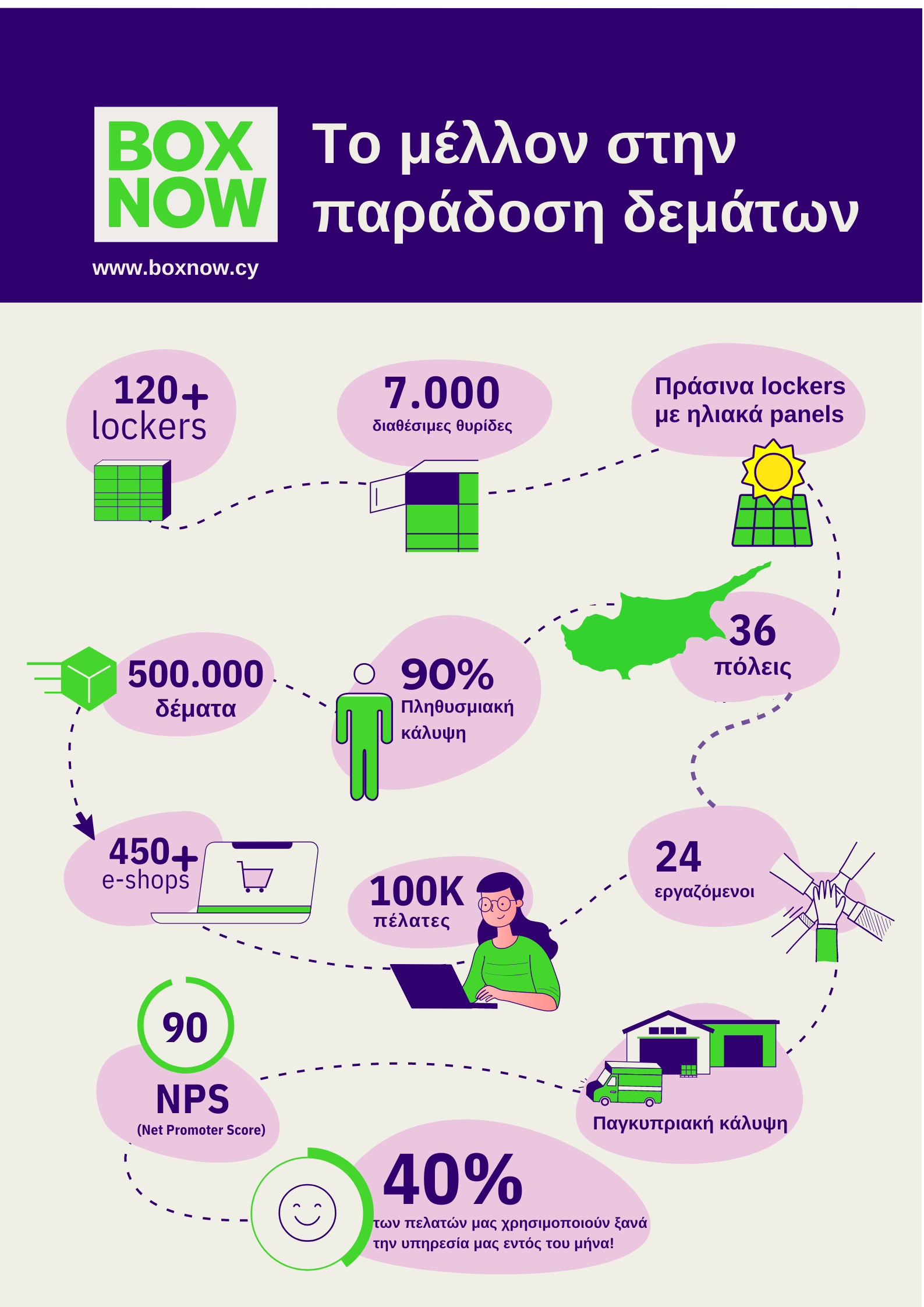 Σε αυτόν τον ένα χρόνο η BΟX NOW έχει καταφέρει να παραδώσει 500.000 δέματα, εξυπηρετώντας 450 συνολικά e-shops. Με 7.000 θυρίδες και 120 Lockers έχει επιτύχει 90% πληθυσμιακή κάλυψη με παρουσία στις 6 μεγάλες πόλεις του νησιού και σε 30 μικρότερα αστικά κέντρα.