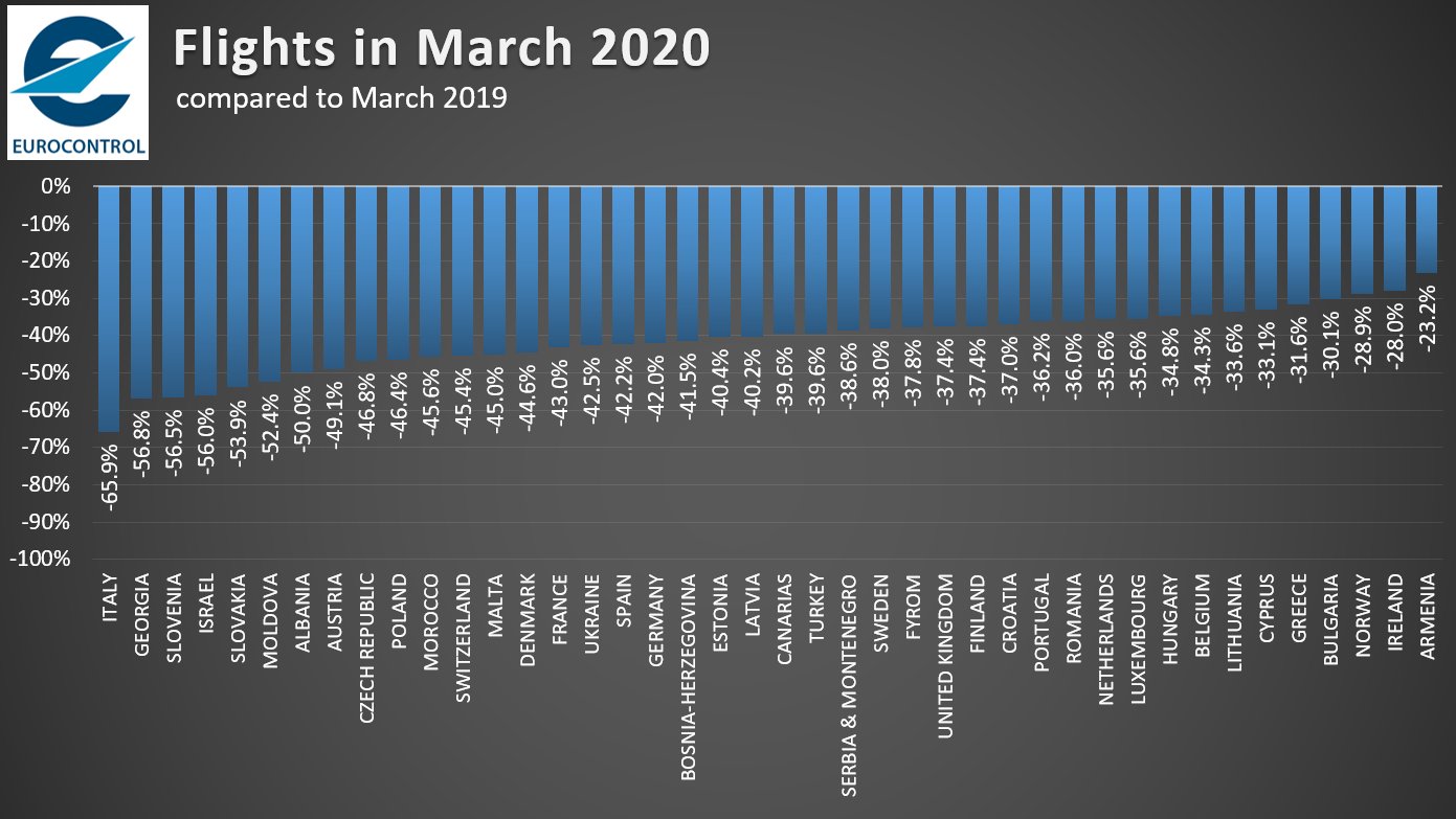 Παρόλ’ αυτά, σε σύγκριση με την κατάρρευση που σημειώνεται σε άλλες ευρωπαϊκές αγορές, η Ελλάδα φαίνεται να έχει σημειώσει καλύτερες …επιδόσεις: Ενδεικτικό αποτελεί το γεγονός ότι με βάση τα συγκεντρωτικά στοιχεία για το μήνα Μάρτιο από τον ευρωπαϊκό οργανισμό για την ασφάλεια στη αεροναυτιλία, το Eurocontrol, όσον αφορά τις πτήσεις σε 42 ευρωπαϊκές αγορές σε σύγκριση με τον αντίστοιχο μήνα πέρυσι, η χώρα μας, με ποσοστό 31,6%, βρίσκεται στην πέμπτη θέση, στις χώρες με τις χαμηλότερες μειώσεις, ενώ την «πρωτιά» κατέχει η Ιταλία με μείωση στον αριθμό των πτήσεων κατά 65,9%. Σε άλλες, μεγάλες ευρωπαϊκές αγορές όπως π.χ. η Ισπανία η πτώση είναι στο 42,2%, στη Γαλλία στο 43%, στη Γερμανία στο 42%, ενώ η Τουρκία έκλεισε τον περασμένο μήνα με μειωμένο αριθμό των πτήσεων κατά 39,6%.
