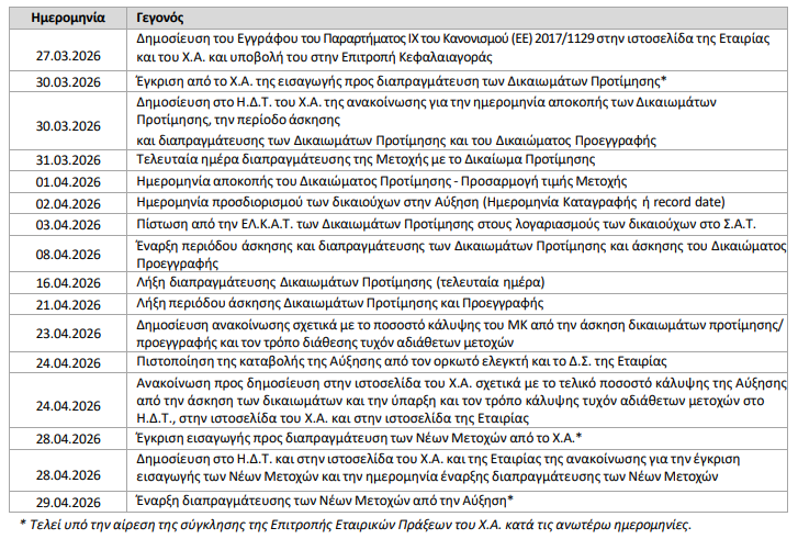 Το αναμενόμενο χρονοδιάγραμμα της ολοκλήρωσης της Αύξησης και της εισαγωγής προς διαπραγμάτευση των Νέων Μετοχών είναι το εξής: